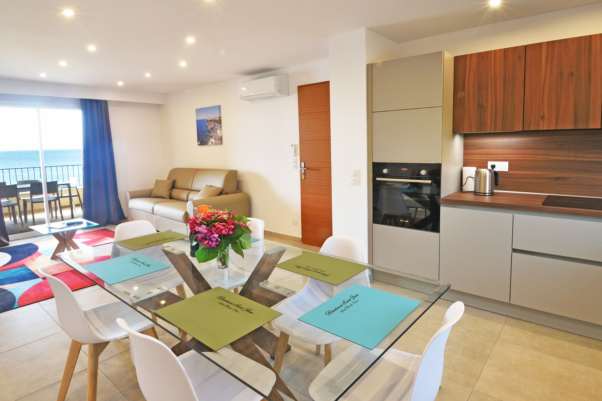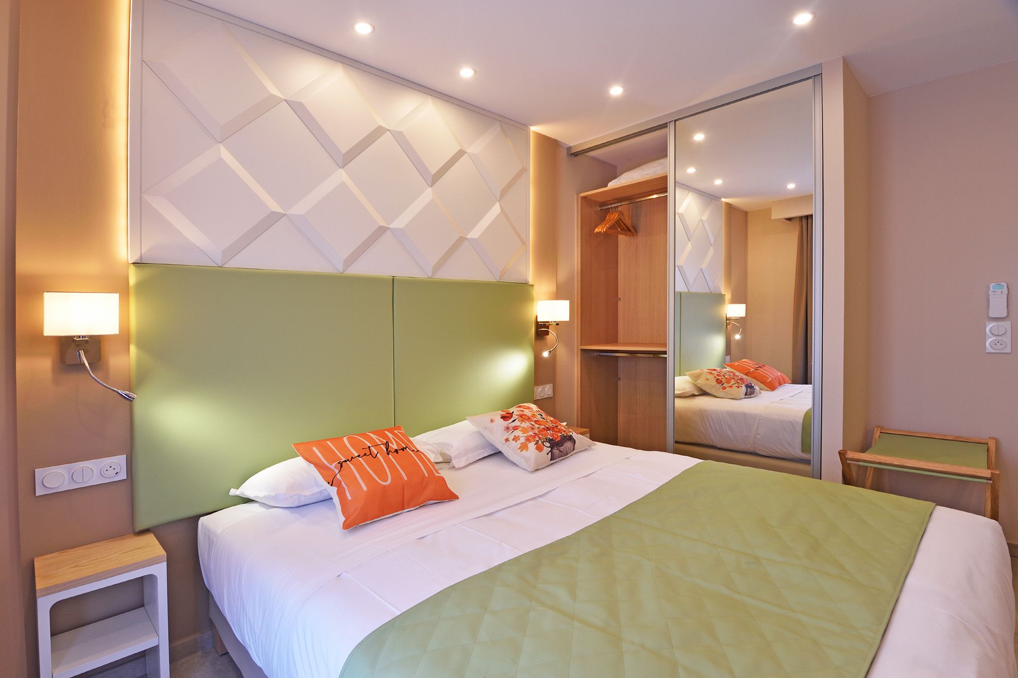 The essence of this room comes to life through fresh colors, essential lines and a natural brightness that envelops the environment with delicacy. The neutral tones of the walls blend harmoniously with the light wood details, while the minimalist furnishings – such as the suspended top and the modern seat – give lightness and functionality to the space. The geometric plays of the wall above the bed add a contemporary and decorative touch, maintaining a sober elegance. The sea horizon view completes the atmosphere, turning the room into an intimate retreat, where you can relax and be lulled by the sound of the waves.