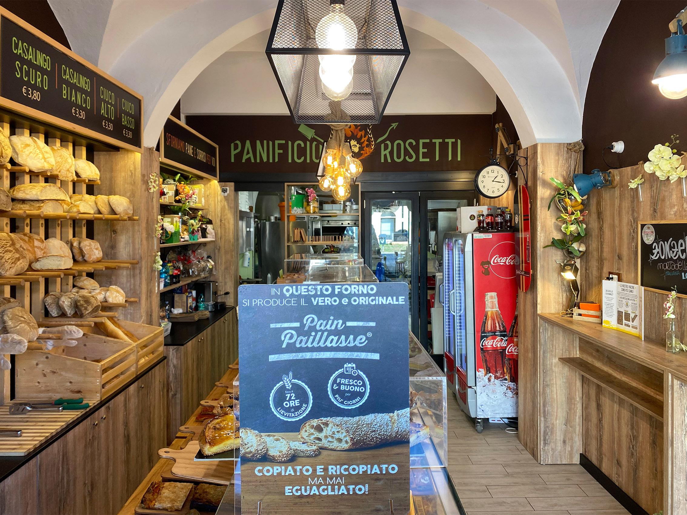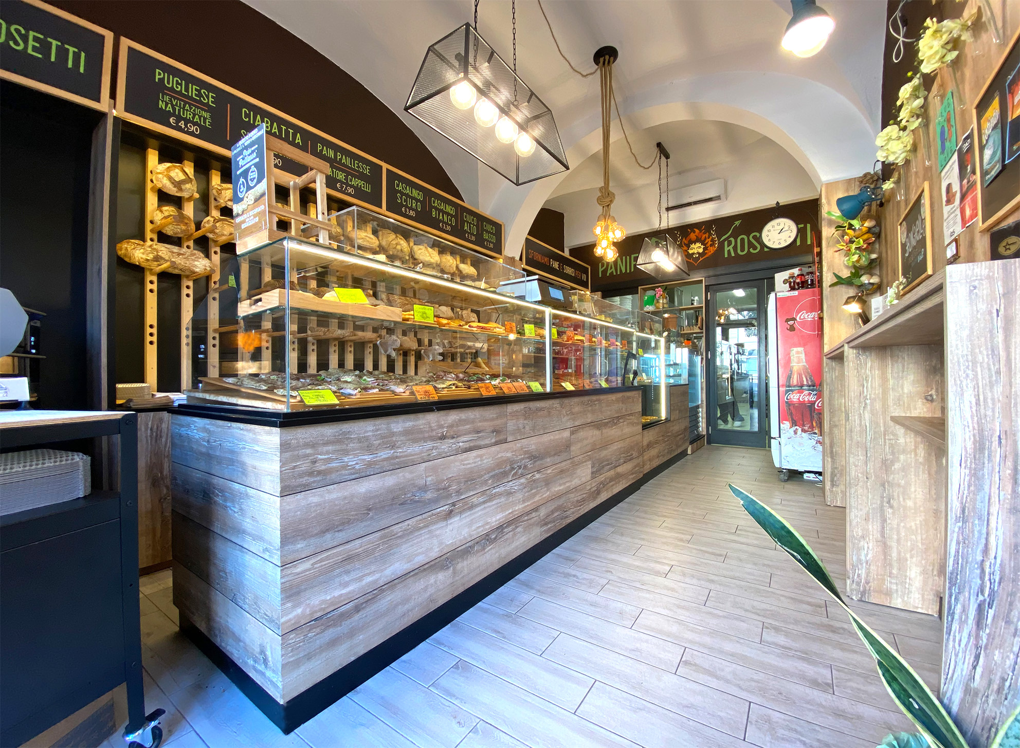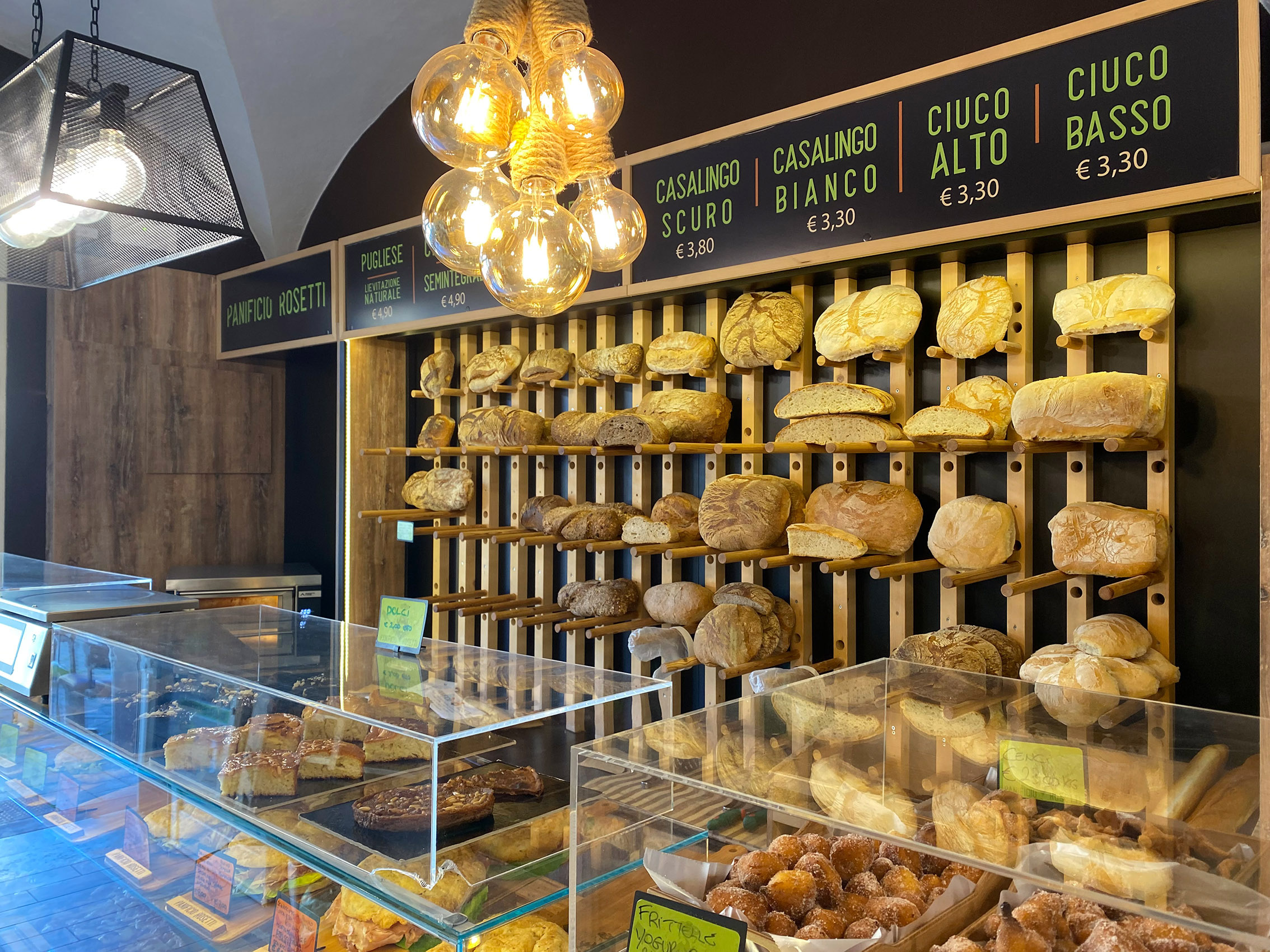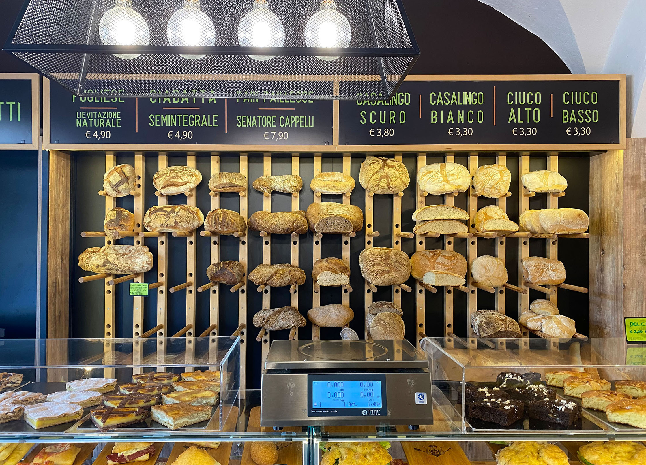 The visual identity of this bakery is based on a harmonious balance between artisan tradition and contemporary taste. The material warmth of wood, present in the coverings, shelves and display bench, creates a welcoming and authentic environment, in which every detail recalls the quality and authenticity of the product. The dark walls enhance the texture and shades of the exposed bread, enhanced by an orderly and scenographic display grid, which conveys a strong sense of craftsmanship. The warm lighting, with industrial-style pendant lamps and jute strings, enriches the atmosphere with a rustic and distinctive touch. The green writing on a black background and the wall graphics complete a coherent visual concept, which forcefully and clearly recounts the passion for handmade bread.