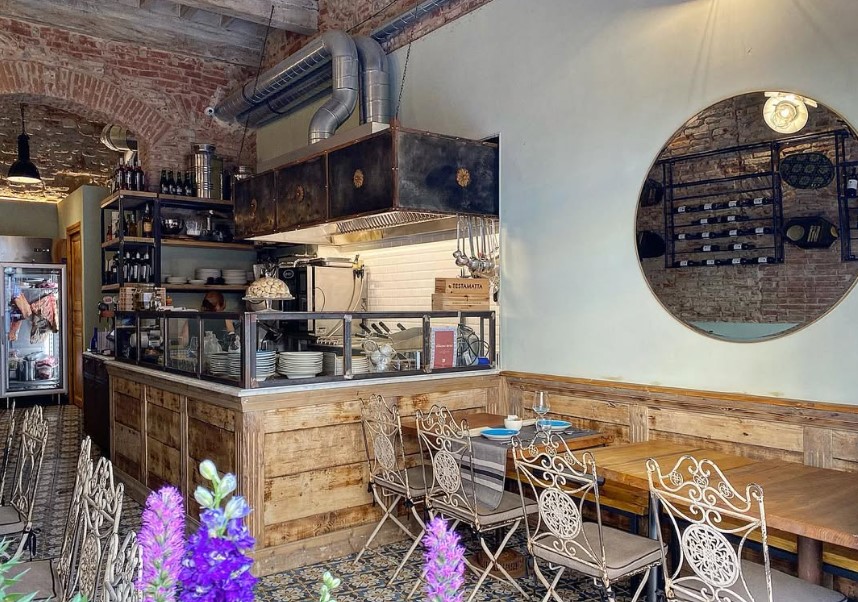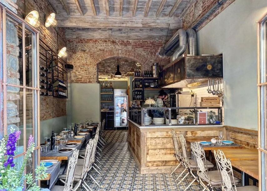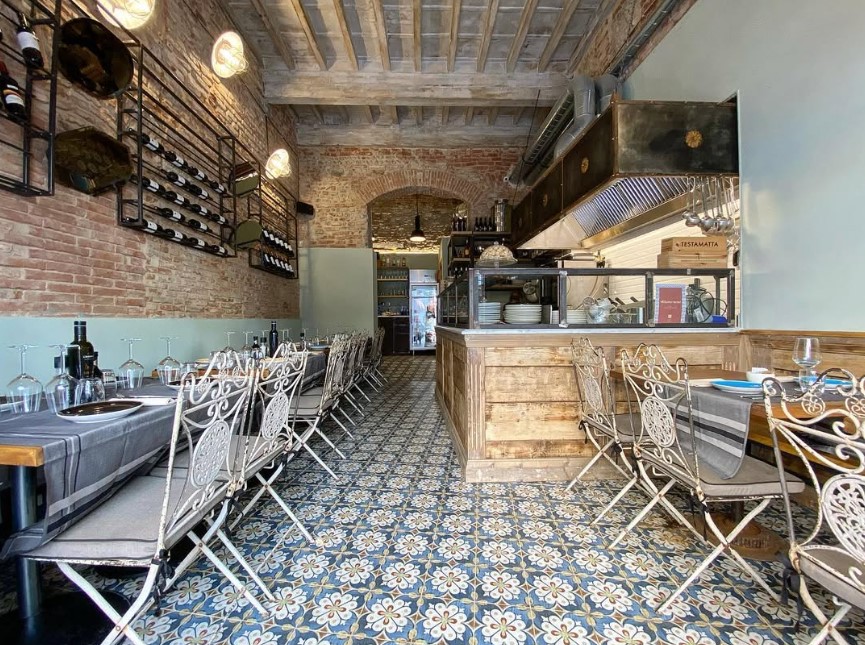 The authentic soul of this space takes shape through a refined balance between rusticity and sophistication. Exposed bricks, wooden beams and the skilful use of raw materials such as iron and lived-in wood convey a warm and genuine identity, deeply rooted in tradition. The decorated floor, with desaturated tones and a geometric design, adds a vintage touch that elegantly contrasts the contemporary functionality of the open kitchen. The industrial lights, the exposed channel ventilation system and the wrought iron furnishings contribute to an urban and sophisticated aesthetic, without losing the sense of hospitality typical of the Italian trattoria. The result is a space with a convivial and authentic atmosphere, where every detail –from the wines on display to the carefully stacked dishes – tells a story of passion, craftsmanship and territory.