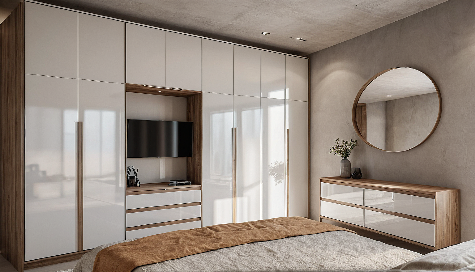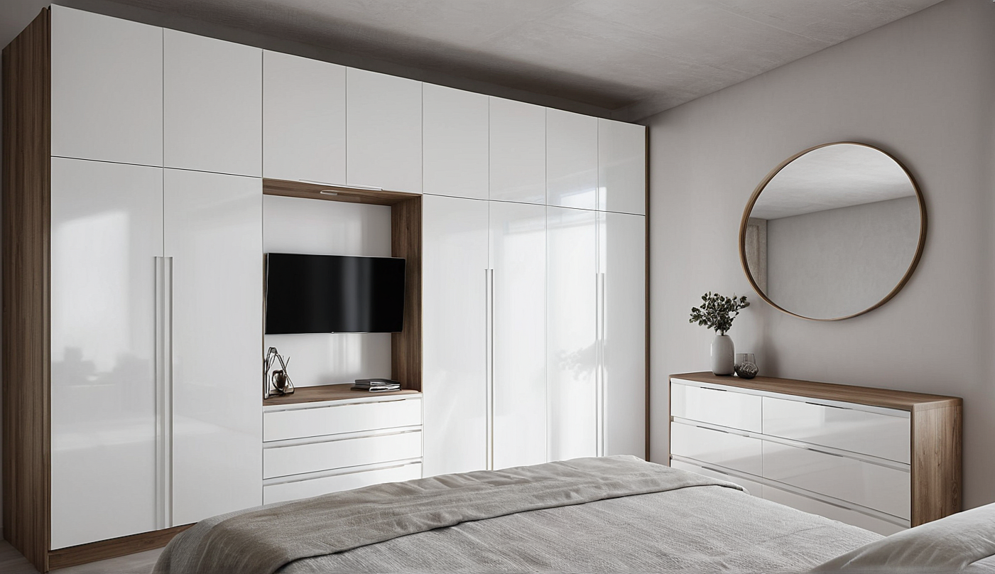 The visual identity of this bedroom is built on the balance between geometric rigor, material warmth and decorative lightness. The full-wall wardrobes, with smooth and white surfaces, are accompanied by vertical wooden handles that guide the gaze along an orderly and harmonious whole, where each element is the protagonist in its balance. The central compartment with TV, framed by wooden details, creates a functional and refined focal point. The dresser, with its combination of glossy finishes and wood, adds continuity and warmth to the space, while the large round mirror with wooden frame amplifies the depth and light, giving a dynamic but always elegant rhythm. The color palette, played on neutral shades of white, beige and grey, helps to create a relaxing and welcoming environment. A place designed to offer not only comfort and functionality, but also a consistent, refined and memorable aesthetic experience.