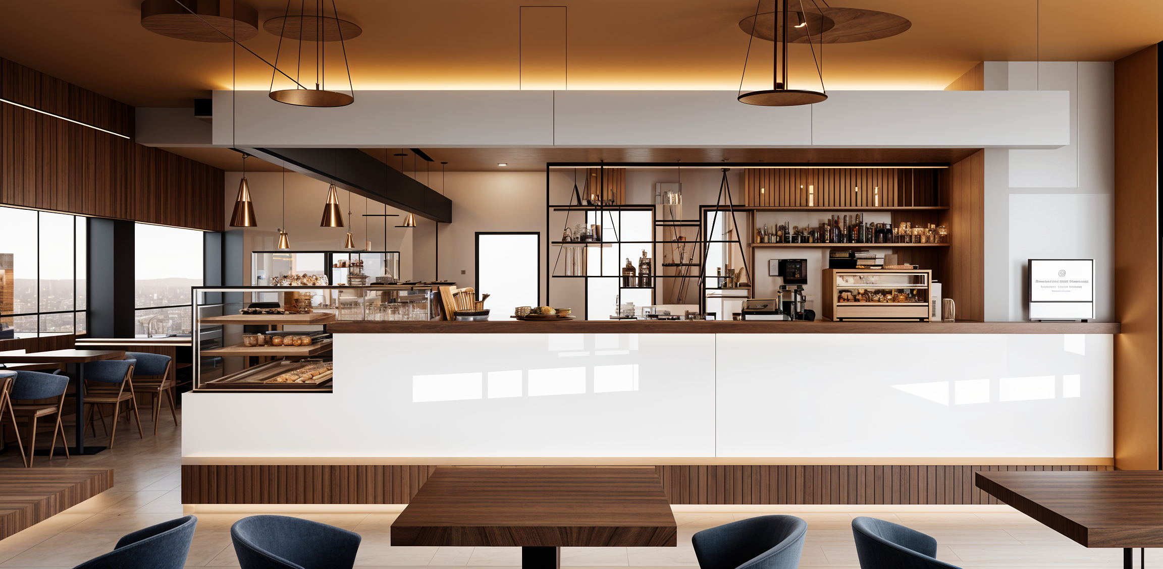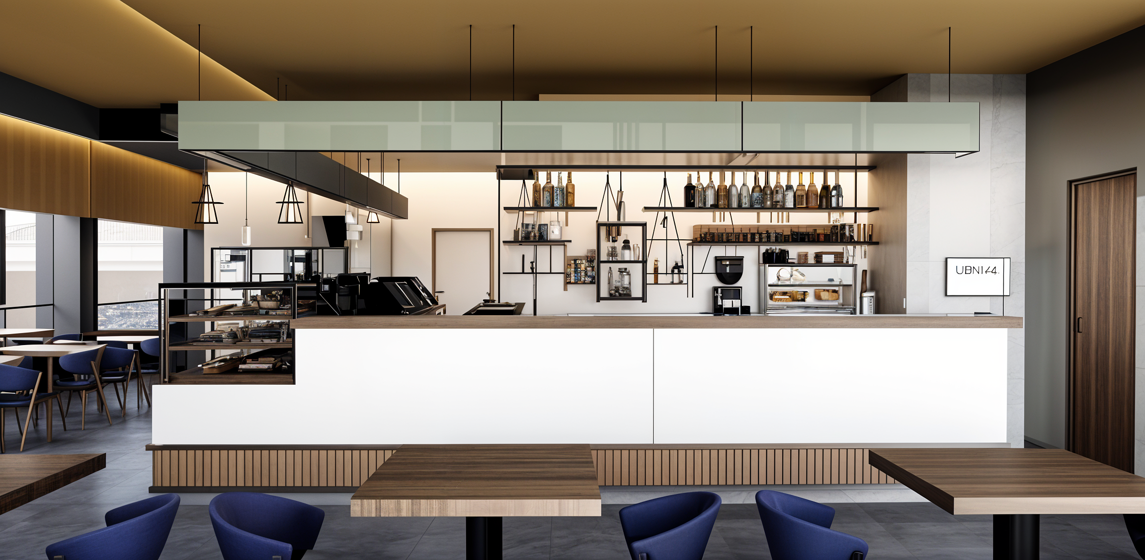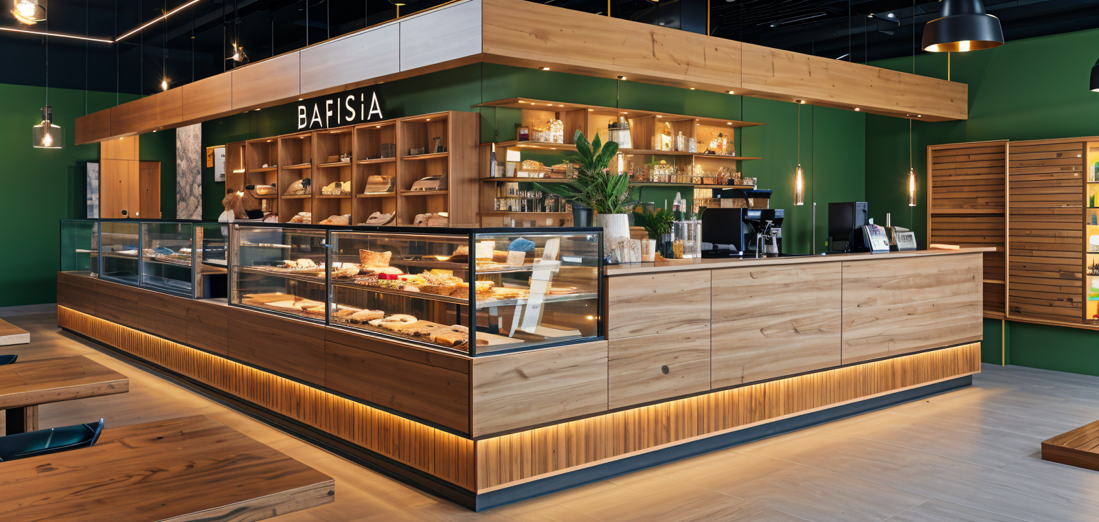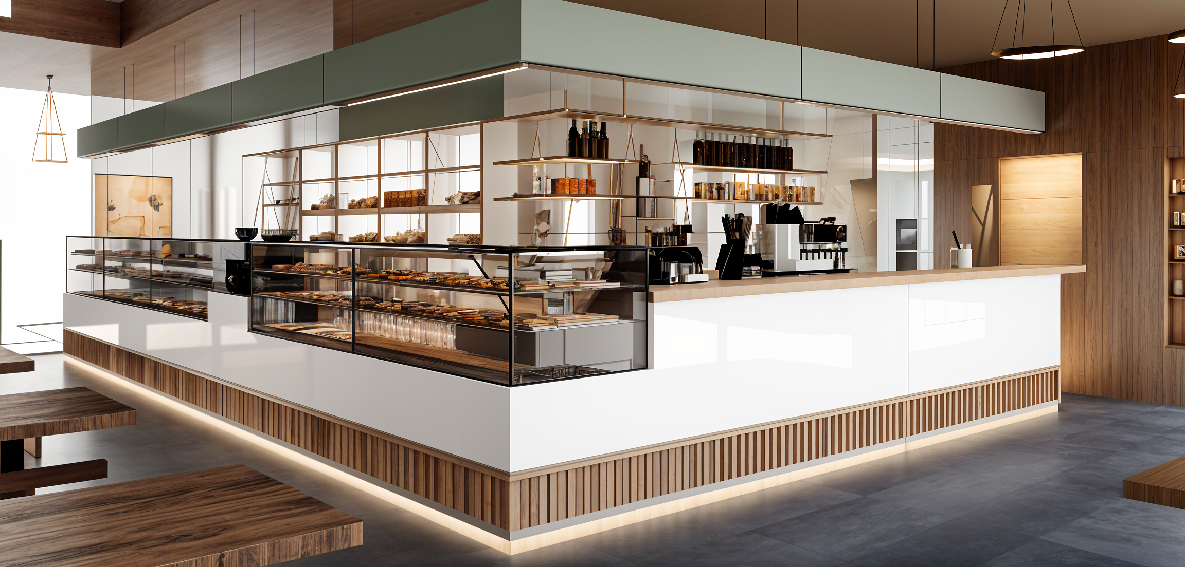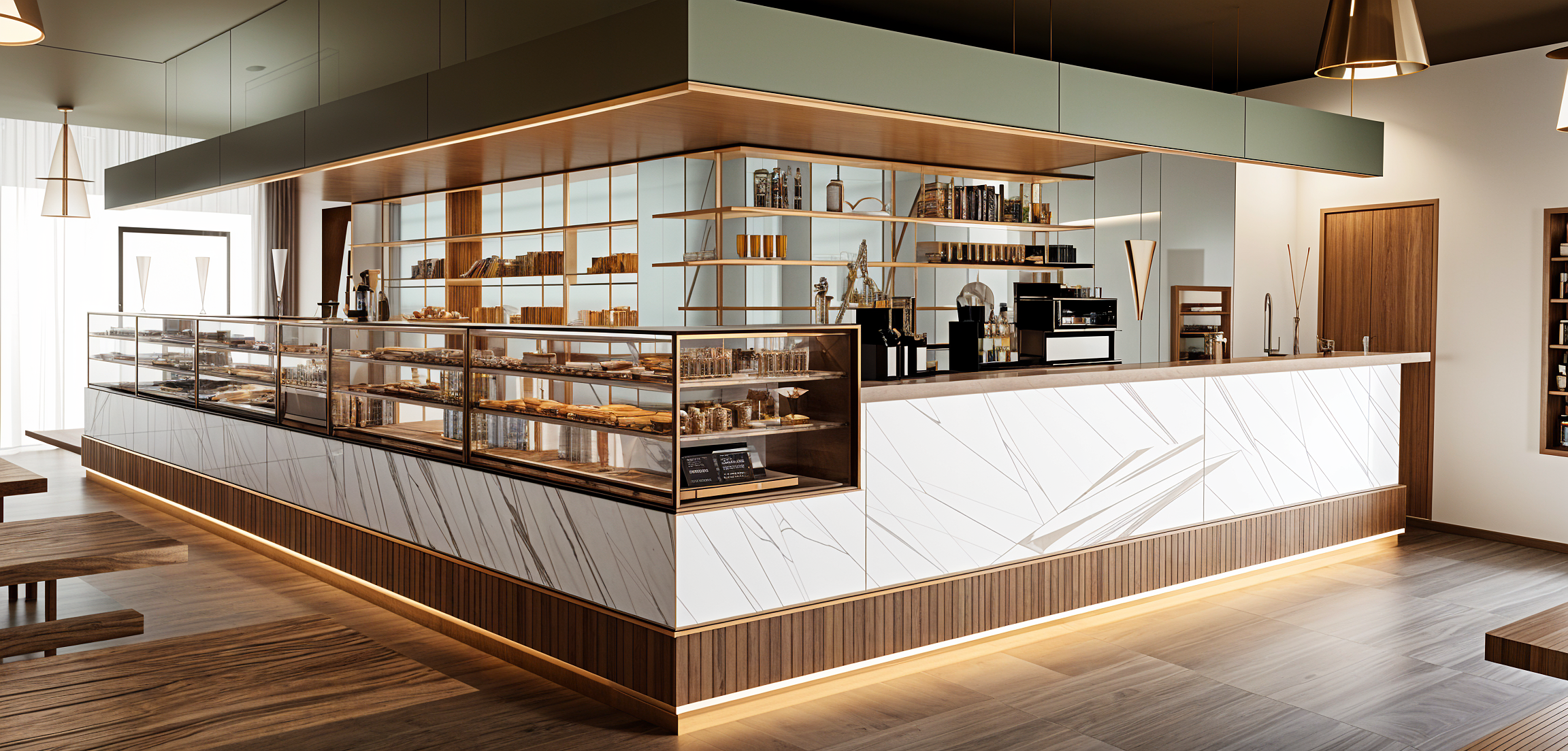 The visual identity of this venue is based on a balance between geometric cleanliness, natural materials and refined details. The counter, covered in elegant slabs of white marble with thin veins, combines with a wooden base with vertical lines that adds warmth and texture, creating a harmonious and welcoming effect. The transparent glass display cases highlight the products with order and precision, while the wooden shelves and golden metal details give lightness and a touch of discreet luxury. The dark ceiling and minimalist suspension frame the space with a sleek frame, emphasizing functionality and contemporary aesthetics. The color palette, played on neutral tones, natural wood and metallic accents, builds a relaxing and sophisticated atmosphere. A place designed to enhance the customer experience, combining comfort, functionality and a memorable and distinctive aesthetic.