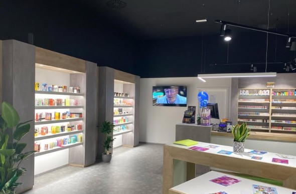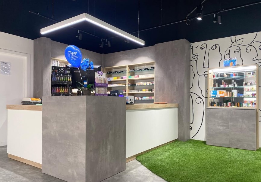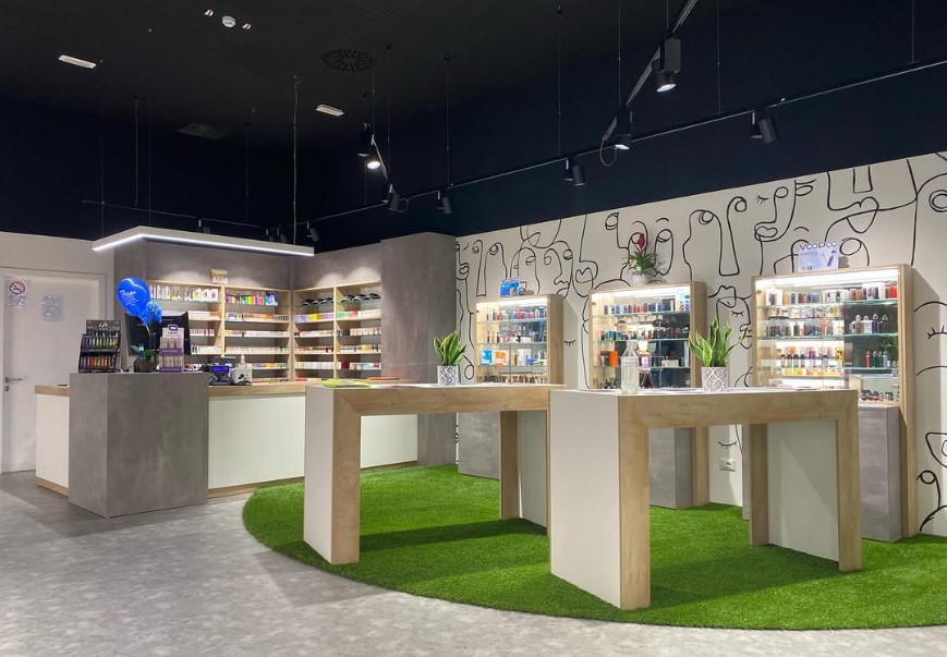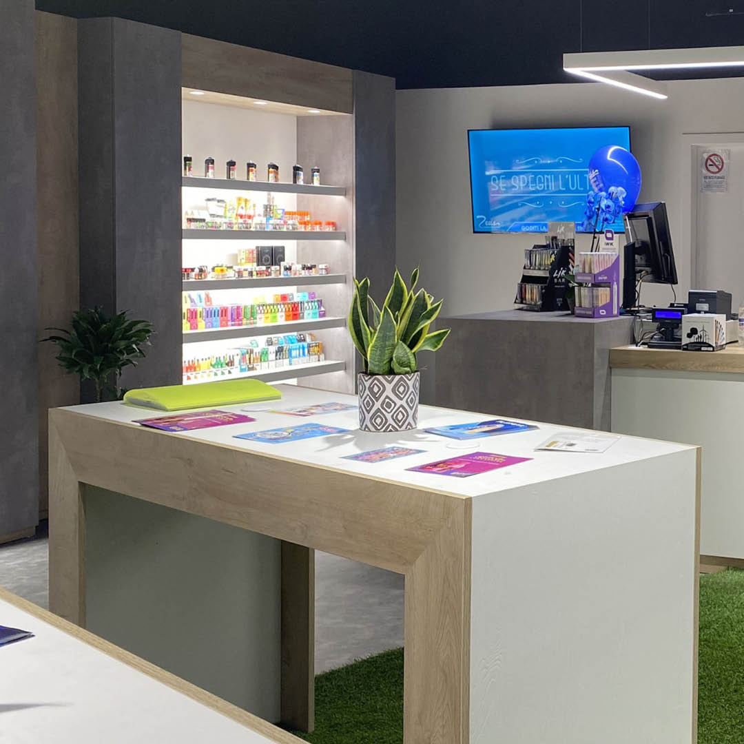 The essence of this space comes to life through a harmonious play between modern minimalism and touches of originality. The clean lines of the furnishings and the material surfaces create a contemporary, tidy and welcoming atmosphere. The bright green of the synthetic lawn breaks the chromatic linearity with a fresh and natural note, giving energy and liveliness to the environment. On the walls, an illustration with an essential line accompanies the gaze, giving personality and dynamism to the space. The technical lighting, with adjustable rails and spotlights, enhances the details and enhances the products displayed with scenographic precision. The rigorous organization of the exhibitors and the skilful use of space convey a sense of order and professionalism, without sacrificing that creative touch that makes the shopping experience enjoyable and engaging.